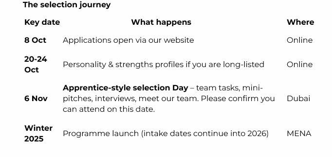 Email everything to MakeMeYourMENAGrad25@four.agency by 23:59 (BST) Sunday 19 October 2025.